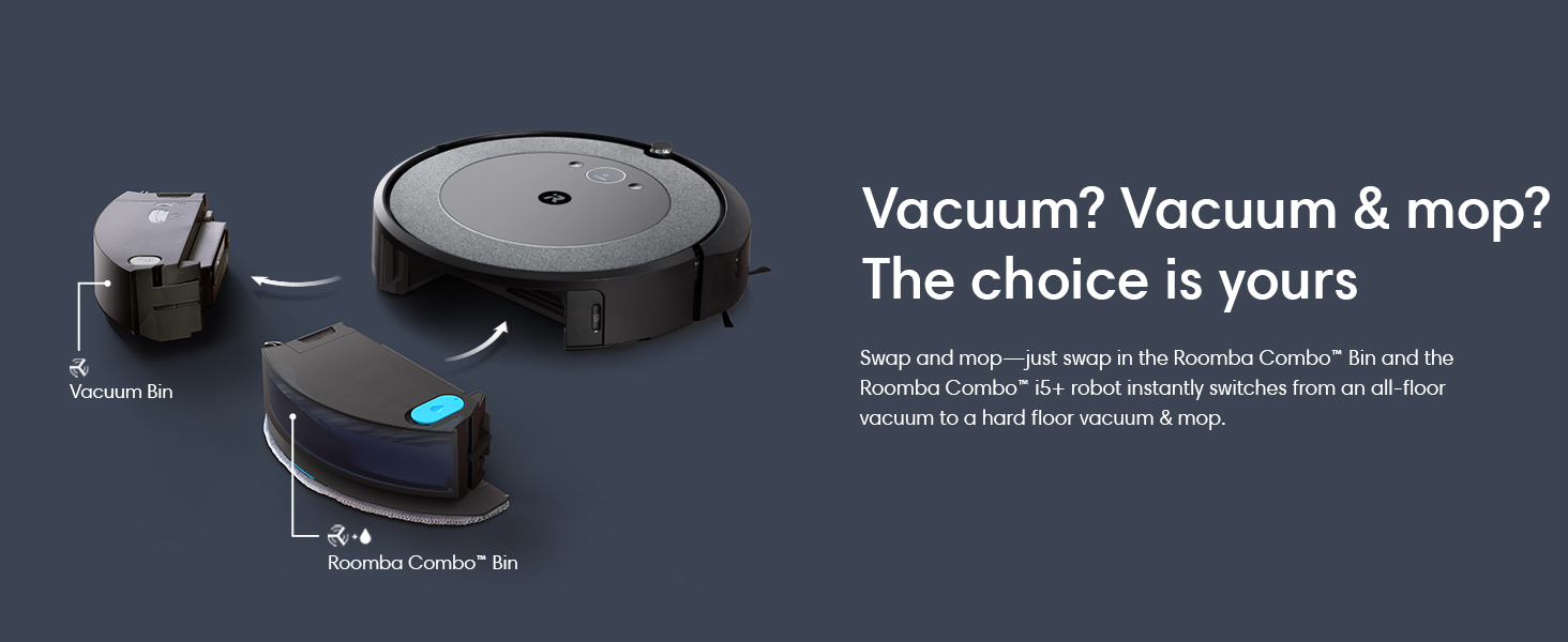 - DOUBLE THE CLEAN WITH ONE MACHINE. The Roomba Combo i5 plus robot vacuum and mop is designed for both wet and dry floor cleaning—converting from an all-floor vacuum to a vacuum and mop, with the simple switch of a bin.